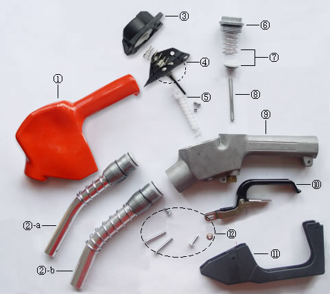 | 1、皮套2、枪嘴(a.小枪嘴 b.大枪嘴)3、阀盖4、自控膜5、自封杆6、枪盖7、弹簧座8、顶杆 9、枪体 10、杠杆11、护手12、铆钉 |